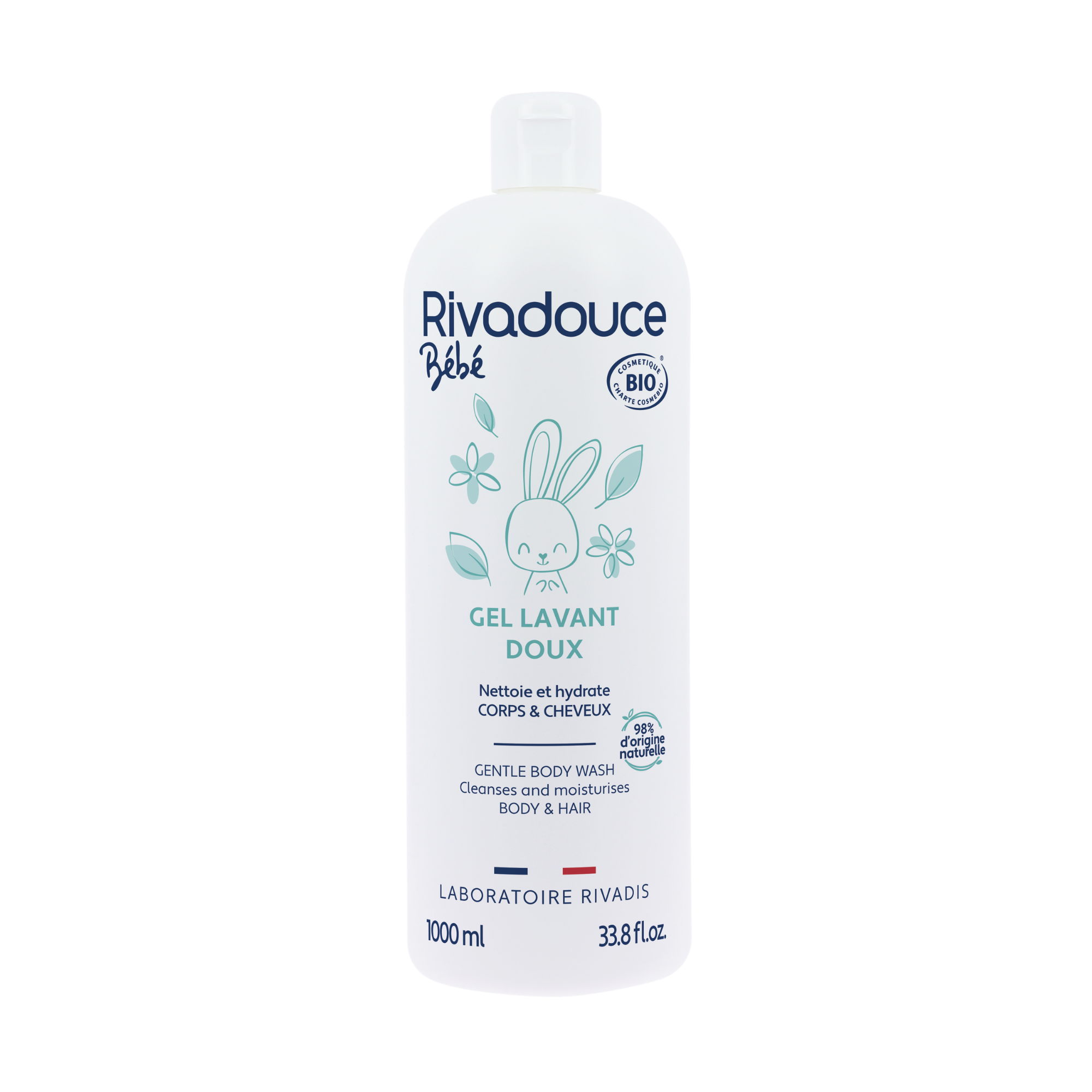 Formulated for sensitive skin of babies and toddlers, Rivadouce Bébé Gentle Cleansing Gel gently cleanses and preserves baby's skin and scalp. It contains no soap, and 98.8% of the ingredients are of natural origin. Its ultra-gentle, soap-free cleansing formula hydrates the skin and compensates for the drying effects of hard water, leaving the skin soft, supple and delicately scented. Rinses off easily. Does not sting the eyes. Biodegradable formula.
